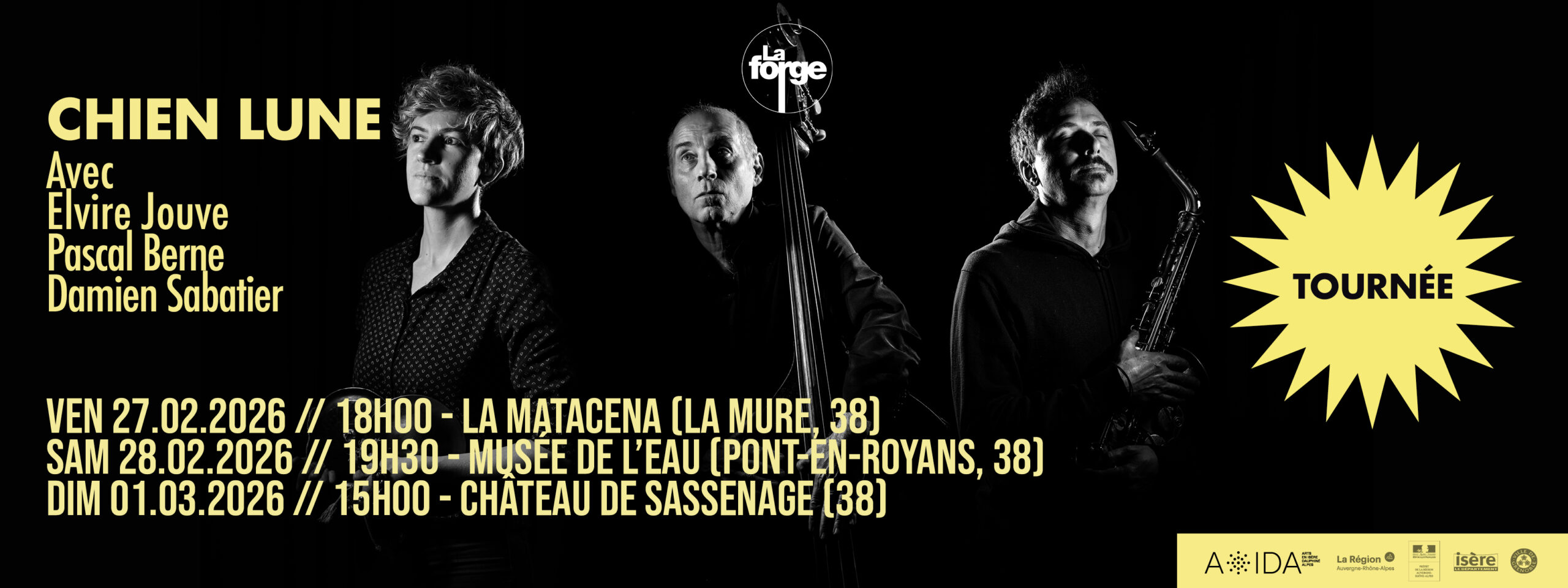- 28 février : Concert de CHIEN LUNE • Avec Elvire Jouve, Damien Sabatier & Pascal Berne • Musée de l’Eau (Pont-en-Royans, 38) • 19h30 // Tournée Les Allées Chantent